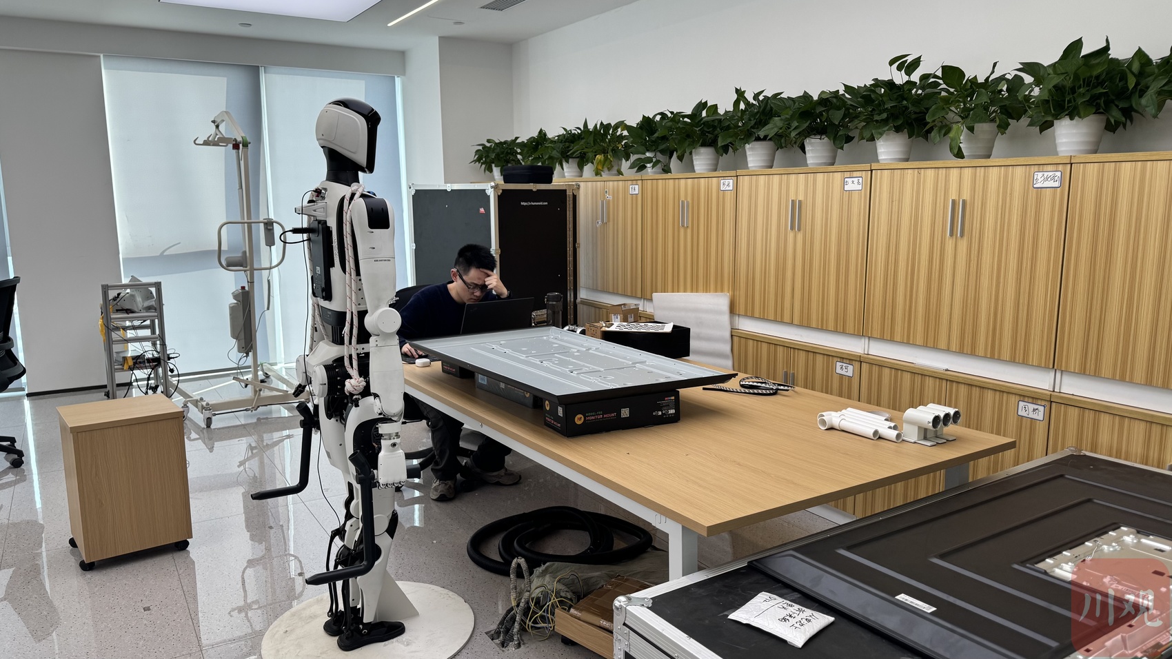 这里除了是绵阳市属国企四川九洲电器集团有限责任公司在成都的办公基地,也是中国(绵阳)科技城科产协同中心(以下简称“协同中心”)。去年9月,作为四川省人形机器人创新联合体和四川省人形机器人制造业创新中心的牵头单位,兵器自动化所公司的机器人创新中心整体搬迁至此,使用九洲集团位于成都市锦江区这栋办公大楼的三层、总共约2400平方米的空间。