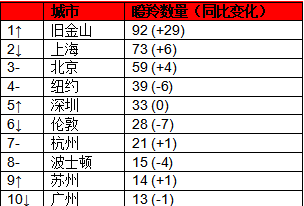 具体到全球城市看,旧金山、上海、北京、纽约、深圳、伦敦、杭州、波士顿、苏州、广州是全球范围内上榜企业最多的十个城市。中国的上海、北京、深圳、杭州、苏州、广州上榜企业数量分别是73家、59家、33家、21家、14家、13家。