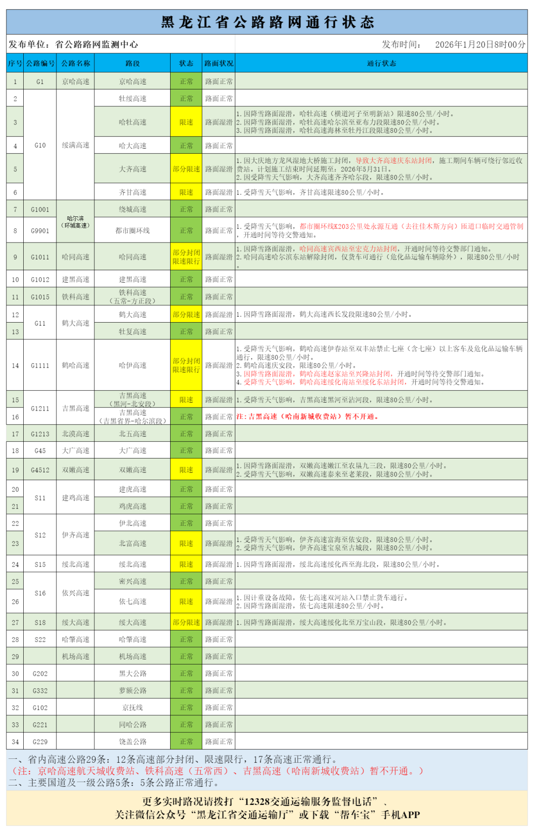 4.哈同高速(哈尔滨东站),仅货车可通行(危化品运输车辆除外),限速80公里/小时。省内其它高速路况正常。