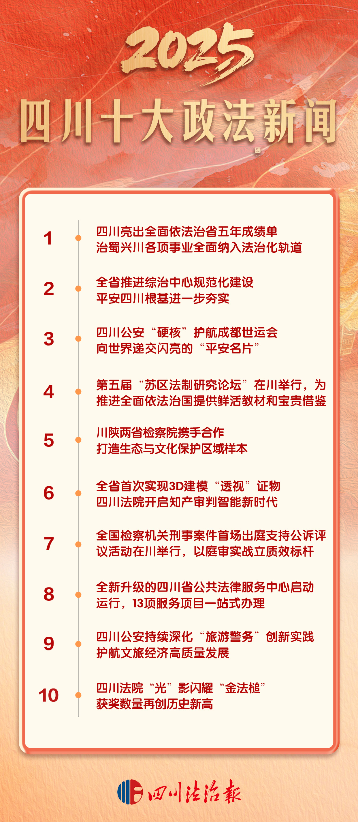 1月20日,由四川法治报主办,以“梳理年度政法新闻,推动四川法治进程”为宗旨的2025年度四川十大政法新闻揭晓。