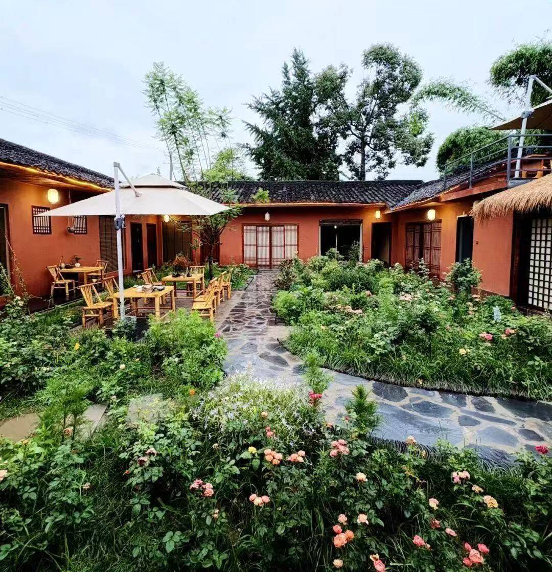 玩累了,就宿在乡村,开启一场“微度假”,体验归园田居的静谧,让内心也在夜色中慢慢静下来。普兴街道白果村的归宿·偶屿民宿,黛瓦红墙的川西四合院里开满鲜花,远离城市喧嚣。