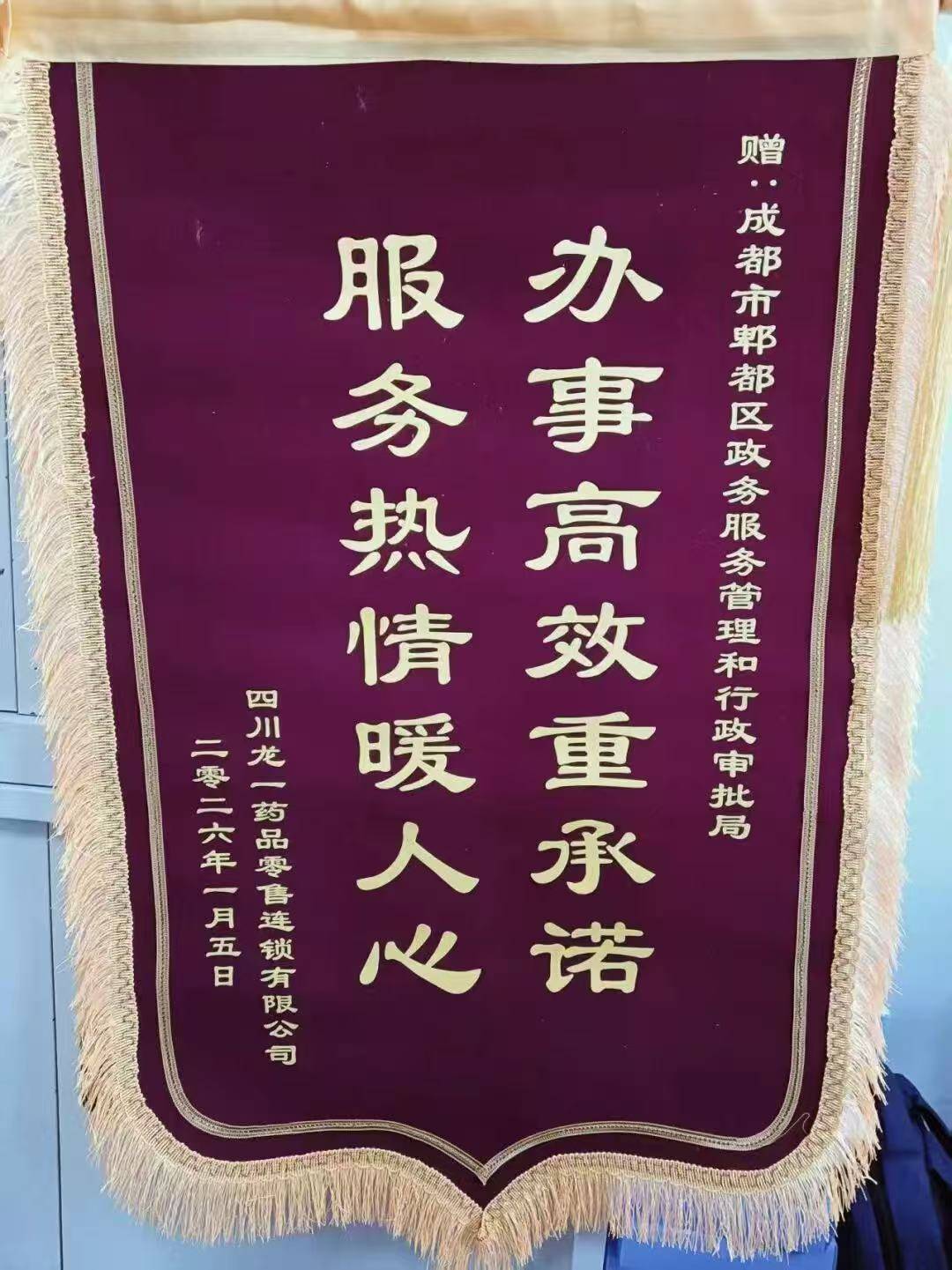 近日,四川龙一药品零售连锁有限公司负责人专程来到成都市郫都区政务服务管理和行政审批局,将一面印有“办事高效重承诺,服务热情暖人心”的锦旗送到工作人员手中,对工作人员的优质服务表达诚挚感谢。