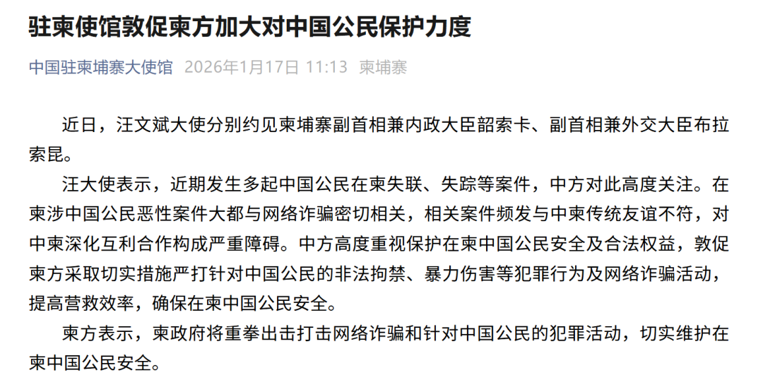 驻柬使馆敦促柬方加大对中国公民保护力度 近日,汪文斌大使分别约见柬埔寨副首相兼内政大臣韶索卡、副首相兼外交大臣布拉索昆。