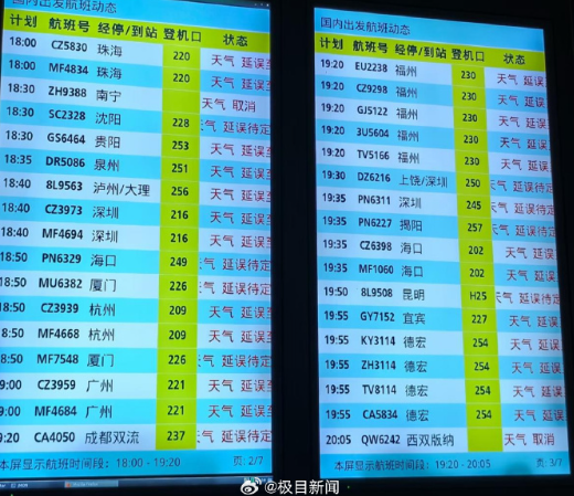 1月20日,受天气影响,南京禄口国际机场出现航班延误情况。截至当天上午9点,南京禄口国际机场已经取消7个航班。南京禄口国际机场官网显示,1月20日当天,南京飞遵义的MU2823,南京飞长沙的MU2753、MF3379,南京飞成都的CA2618等航班取消,累计达到7个。