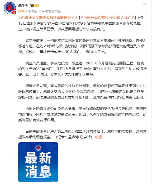 1月20日,@新华社:针对18日西班牙南部安达卢西亚自治区科尔多瓦省高铁脱轨事故的调查正在加紧推进。初步调查结果显示,事故原因可能与铁轨破损有关。