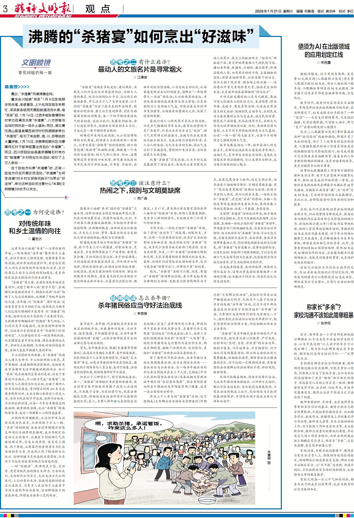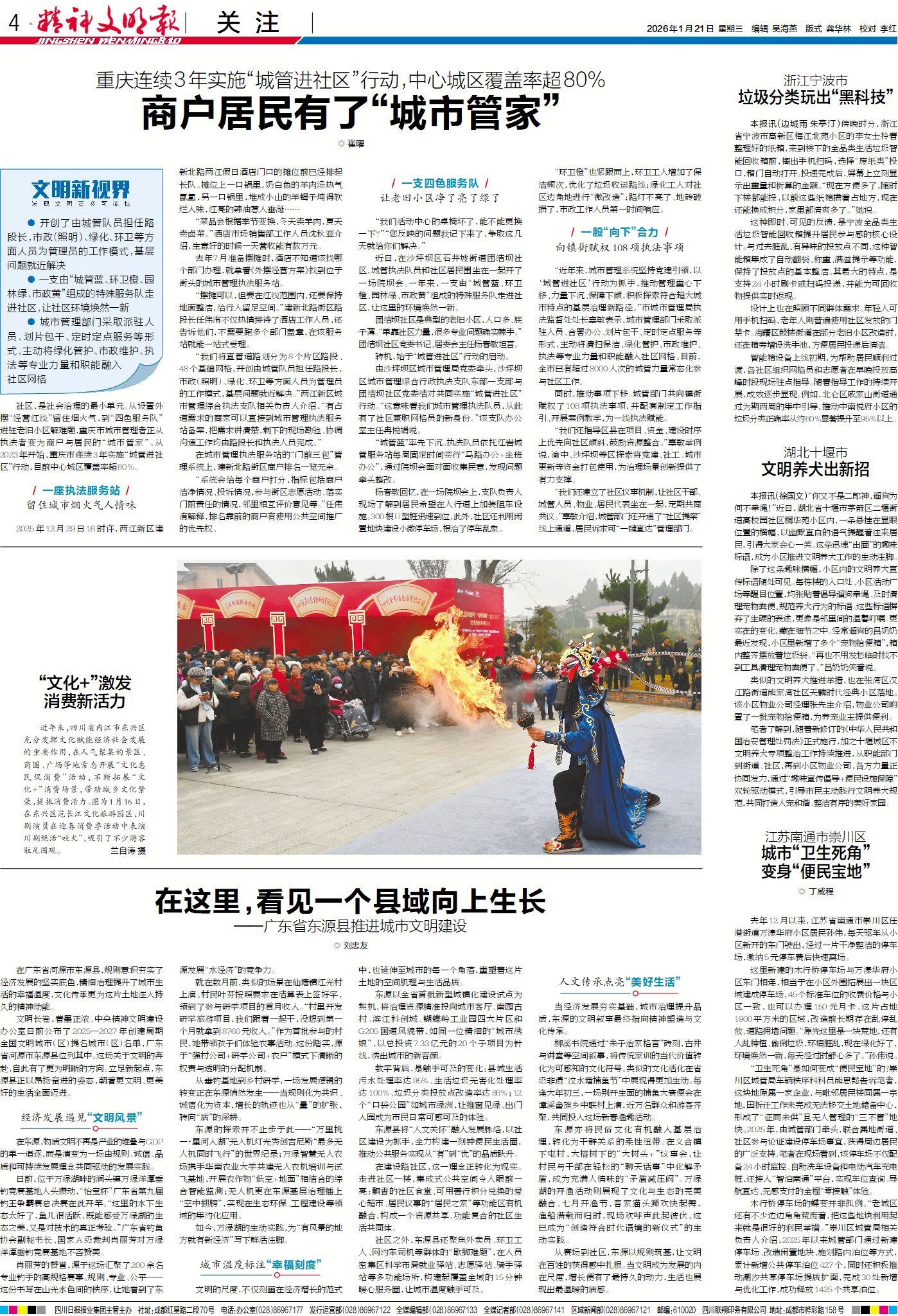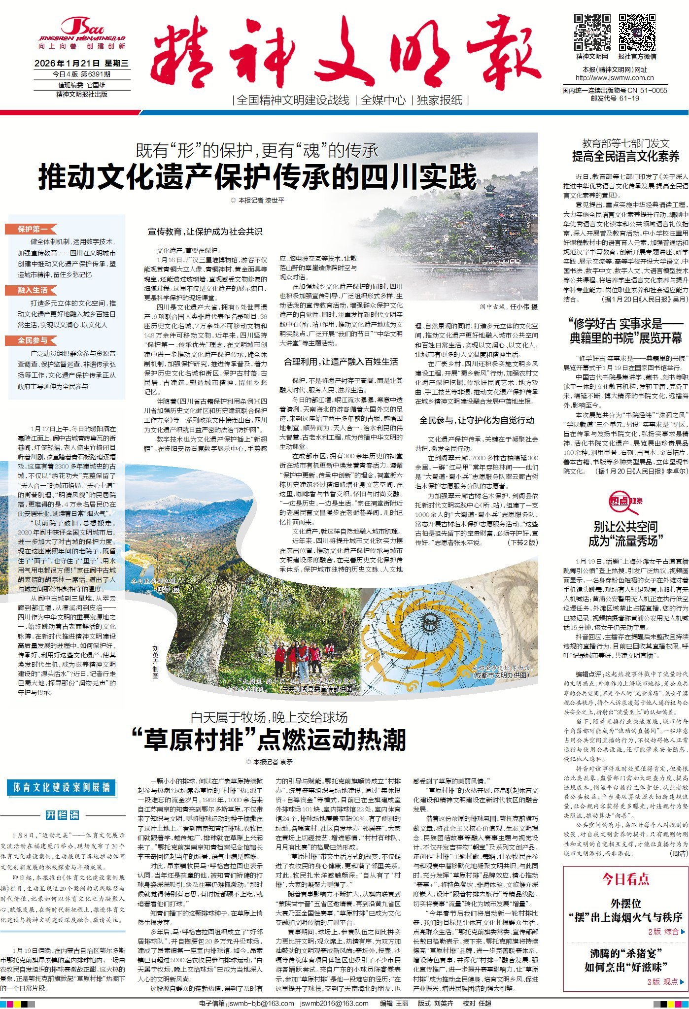 今日版面“早”知道:1版头条带您聚焦四川实践,看巴蜀大地如何守护文化遗产、延续文明根脉;《体育文化建设案例展播》栏目走进内蒙古鄂托克前旗,看“草原村排”以体育之力点亮群众生活;《热点观察》栏目直击上海外滩女子占道直播跳舞引公愤事件,追问公共空间的文明边界。3版《文明棱镜》栏目思考多地“杀猪宴”热潮背后的原因、启示和需要规避的隐患与守正创新的方向。4版《文明新视界》栏目解析重庆如何通过连续3年实施“城管进社区”行动,让商户居民有了“城市管家”。