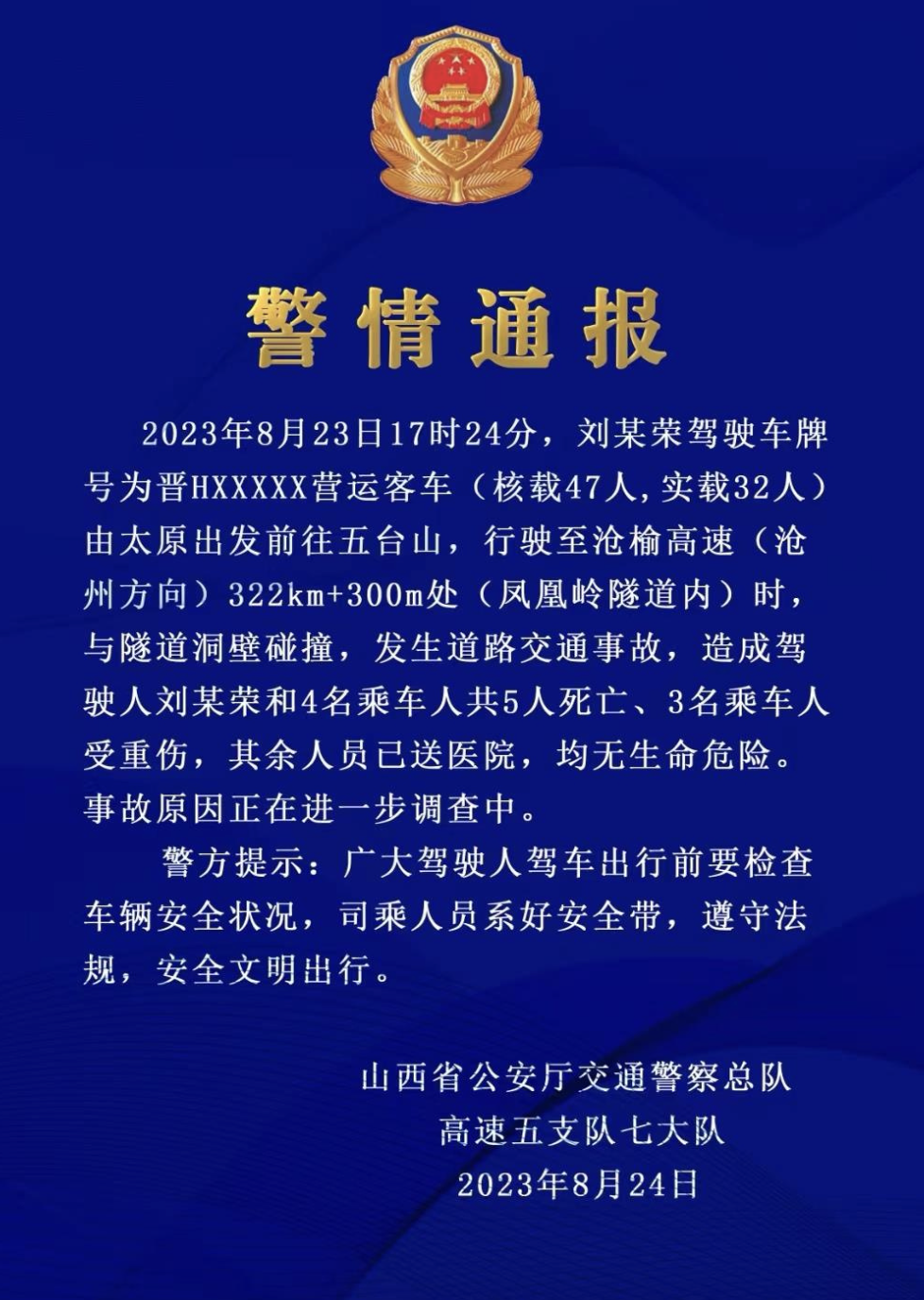 2023年8月23日17时24分,刘某荣驾驶车牌号为晋HXXXXX营运客车(核载47人,实载32人)由太原出发前往五台山,行驶至沧榆高速(沧州方向)322km+300m处(凤凰岭隧道内)时,与隧道洞壁碰撞,发生道路交通事故,造成驾驶人刘某荣和4名乘车人共5人死亡、3名乘车人受重伤,其余人员已送医院,均无生命危险。