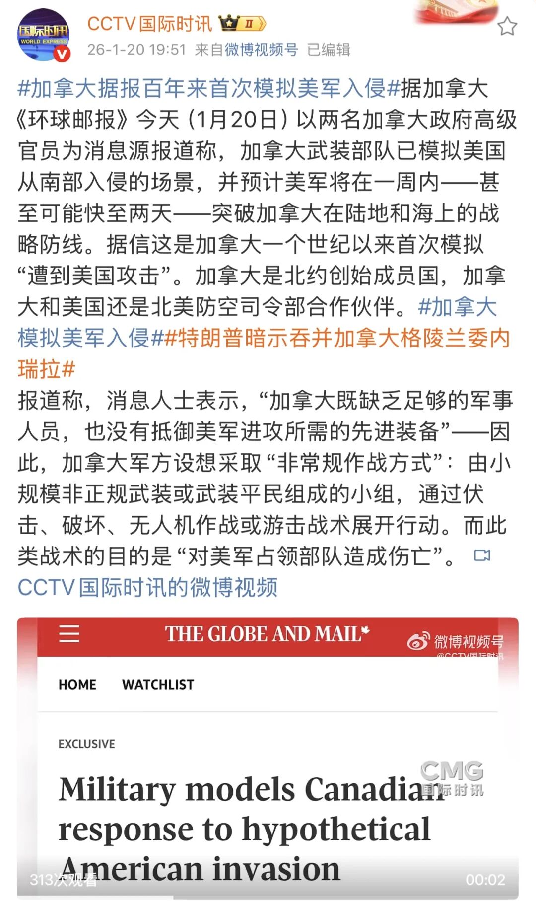 据加拿大《环球邮报》今天(1月20日)以两名加拿大政府高级官员为消息源报道称,加拿大武装部队已模拟美国从南部入侵的场景,并预计美军将在一周内——甚至可能快至两天——突破加拿大在陆地和海上的战略防线。据信这是加拿大一个世纪以来首次模拟“遭到美国攻击”。加拿大是北约创始成员国,加拿大和美国还是北美防空司令部合作伙伴。