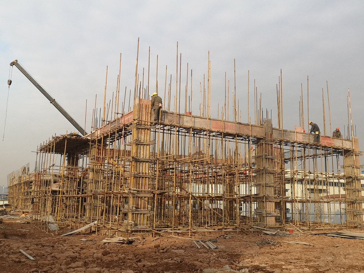 再看其他厂房,系混凝土钢筋框架结构,密集的钢筋齐刷刷竖立朝天,有的正在搭内支模架,有的在准备浇筑混凝土。