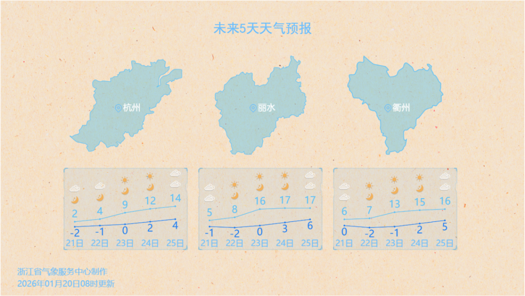 1月20日傍晚到夜里:浙北地区阴有小雨夹雪或雪,后半夜起雨雪止转阴到多云;浙南和东南沿海地区阴部分有小雨或小雨夹雪,高山区局部有雨夹雪或雪;其他地区有小雨夹雪或雪。