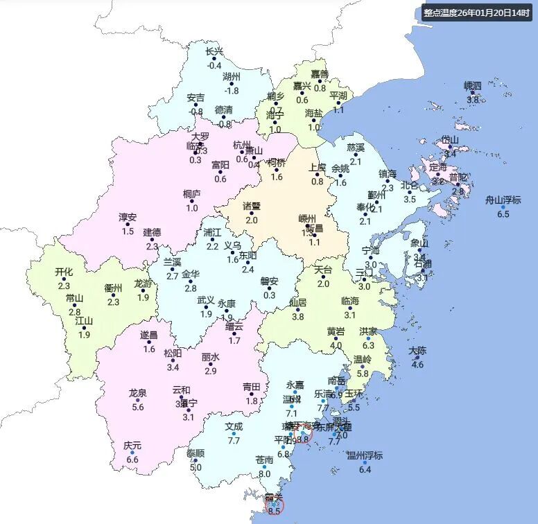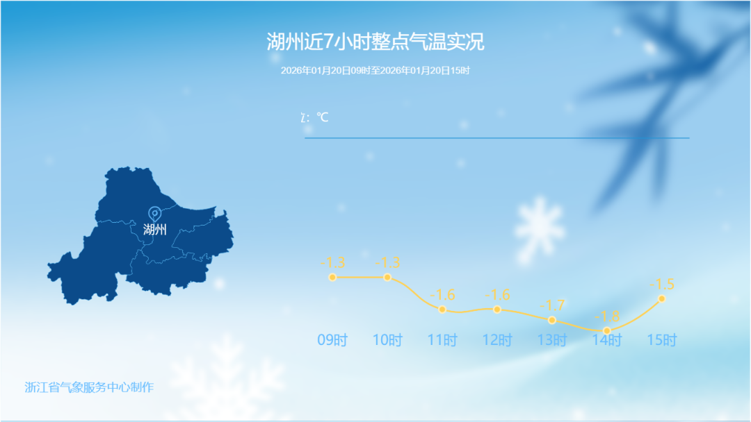 寒潮硬控下,气温显得十分“单薄”,14时整点气温,浙中北0-1℃,浙南3-7℃。点名湖州,截至15时,白天气温一直躺在“冰窟窿”里,都没上过0℃线。