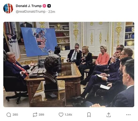 特朗普当天还发布了另一张图片:他在白宫办公室与欧洲领导人会面,后面展板上的地图中,除美国本土外,加拿大、格陵兰岛和委内瑞拉均被美国国旗覆盖。