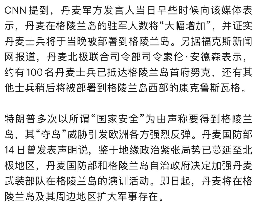 据美国有线电视新闻网(CNN)、福克斯新闻网报道,丹麦当地时间19日向格陵兰岛增派了部队,丹麦军方当日在社交平台X上发布3张照片,显示更多丹麦士兵于当日晚间抵达格陵兰岛。报道称,此举正值美国总统特朗普公开表示希望吞并格陵兰岛之际。