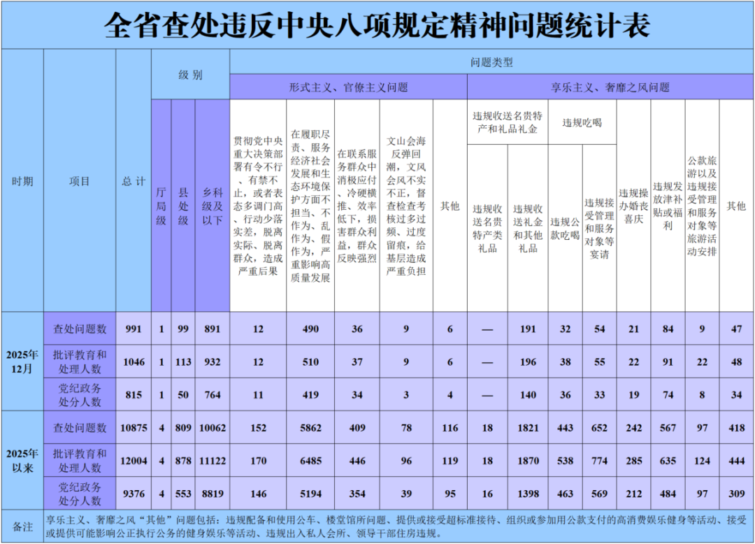 (点击图片放大)2025年12月,黑龙江省纪检监察机关共查处违反中央八项规定精神问题991起,批评教育和处理1046人,其中党纪政务处分815人。