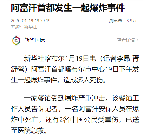 阿富汗首都喀布尔市中心1月19日下午发生一起爆炸事件,造成多人死伤。