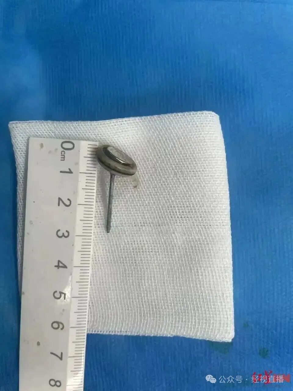 然而,就在术前完善胸片检查时,医护人员发现了更加惊险的一幕:小西的食管内竟卡着一个形似图钉的尖锐金属异物。胸部增强CT检查显示,该异物长达3厘米,已刺破食管壁,尖端紧邻主动脉弓,一旦刺穿大血管,瞬间便会引发大出血,生命危在旦夕。情况紧急,口腔颌面外科立即联系小儿外科协助救治。