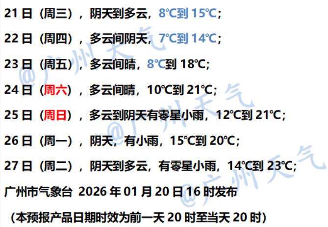 21-22日,韶关、清远北部、肇庆北部阴天,有分散小雨,高海拔山区有雨夹雪或冻雨,其余市县多云到阴天,局部有零星小雨。最低气温:粤北市县1~6℃,其中韶关和清远的高海拔山区-4~0℃,有冰冻,粤西市县12~16℃,其余市县7~10℃。