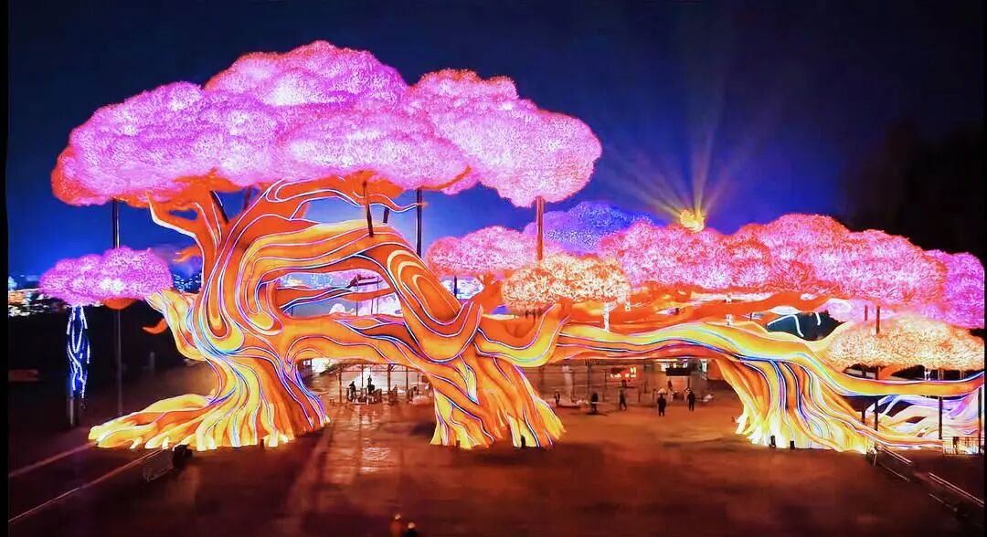 5个月设计、2个月制作,用38万朵绢花的造型编织出巨大的树冠,采用内外光源结合的设计,传递自然生命力与灯会的奇幻美学。“因为是马年,最开始我们想过‘骏马奔腾’‘龙马凌霄’等设计灵感,直到有一天在网上看到一张美陈的烟花树,大家都纷纷点头:‘就是这个感觉’!”