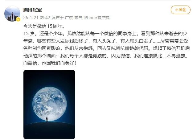 腾讯公司公关总监@腾讯张军也发文称今天是微信15周年,我依然能从每一个微信的同事身上,看到那种从未逝去的少年感,哪些有些人发际线后移了,有人头秃了,有人满头白发了……尽管常常会受各种制约因素影响,他们从未抱怨,回去又吭哧吭哧地敲代码。想起了微信开机启动页的那个画面:我们每个人都是孤独的,因为微信,我们连接彼此,不再孤独。而微信,也因我们而美好!