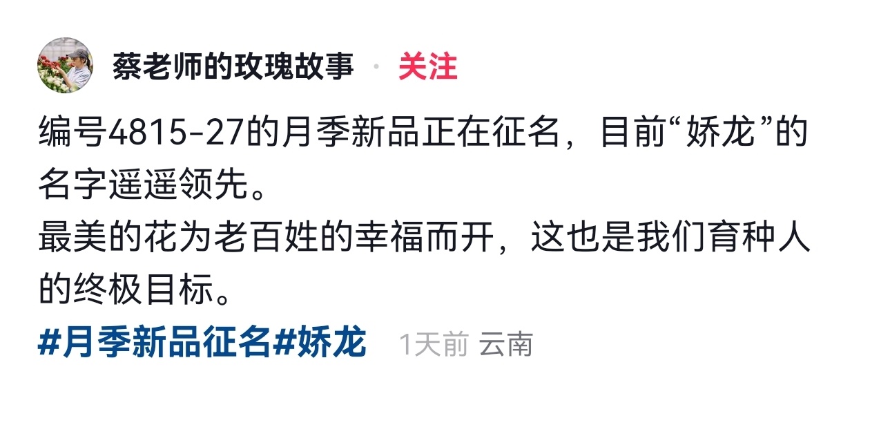 这几天,云南又一个新品种月季(编号4815-27)向全网征名,评论区很多网友提议取名“娇龙”,暖心留言饱含对贺娇龙的深切怀念和崇高敬意。