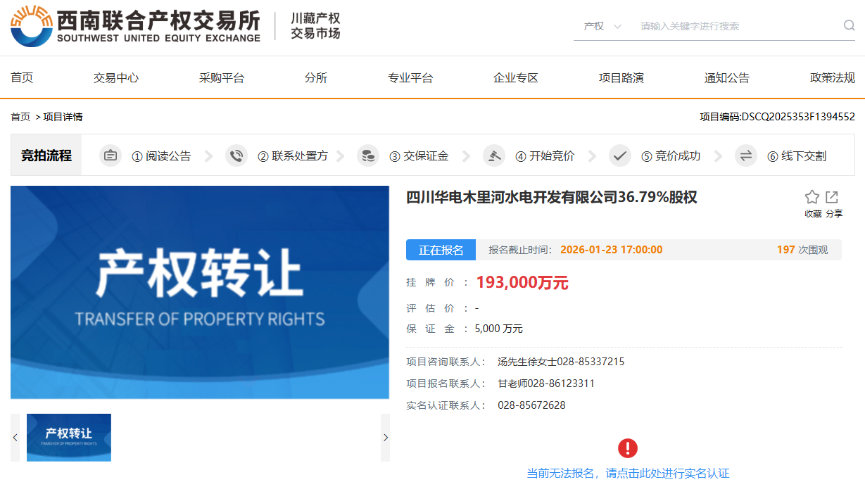 西南联合产权交易所近日的一则挂牌信息显示,央企中国华电集团有限公司旗下重要的在川水电资产——四川华电木里河水电开发有限公司(下称“华电木里河公司”)36.79%的股权,以19.3亿元的底价被公开挂牌转让。转让方为公司第二大股东四川新汇能源有限公司(下称“新汇能源”)。根据公告,本次转让的报名截止日期为1月23日,但截至发稿,该项目暂未有意向受让方现身。