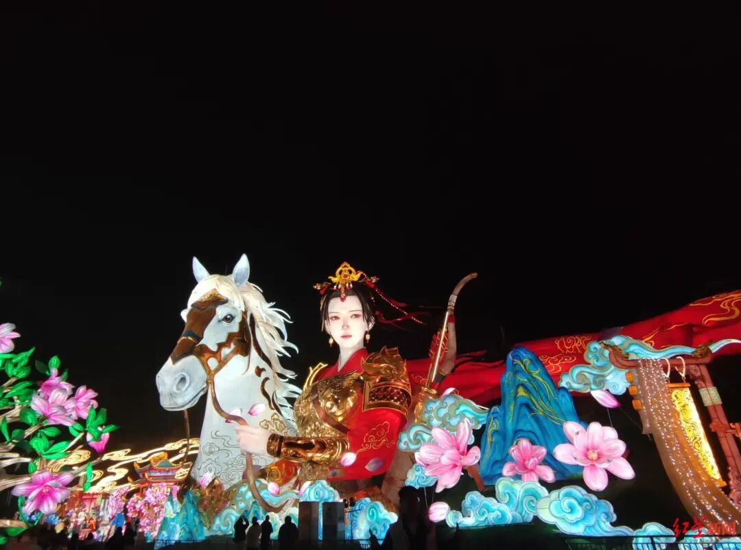 特色灯组方面,有C位灯组“神奇华夏”,它以《庄子·逍遥游》中“鲲鹏”的宏大意象为蓝本,打造了这座全长210米的巨型彩灯。该灯组借鲲鹏展翅之姿,隐喻中国航天从古代飞天遐想到当代“探空、深潜、造器”的跨越腾飞。游客进入灯组内部,中国古代神话中夸父追日、祝融探火、嫦娥奔月等经典场景依次呈现。还有总长180米的“木兰传奇”灯组,该灯组通过“织甲赴戎行”“铁血丹心”“荣归故里”“新年团聚”“魂佑山河”等七个篇章递进叙事,完整再现木兰的传奇一生。其中,巨型花木兰与她的白马“千里雪”半身像,最高处达18米,仅花木兰的披风长度就有40米。