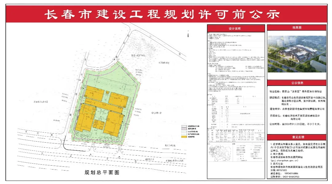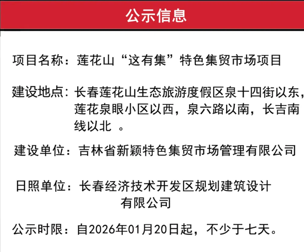 1月20日,长春市规划和自然资源局网站发布莲花山“这有集”特色集贸市场项目建设工程规划许可前公示,建设单位为吉林省新颖特色集贸市场管理有限公司,建设位置在长春莲花山生态旅游度假区泉十四街以东,莲花泉眼小区以西,泉六路以南,长吉南线以北,具体内容如下: