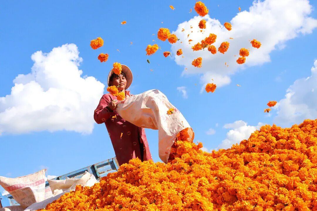 八月,万寿菊以最浓郁的金黄,染透了云南的山地坡岭,也开启了农户们的丰收季。