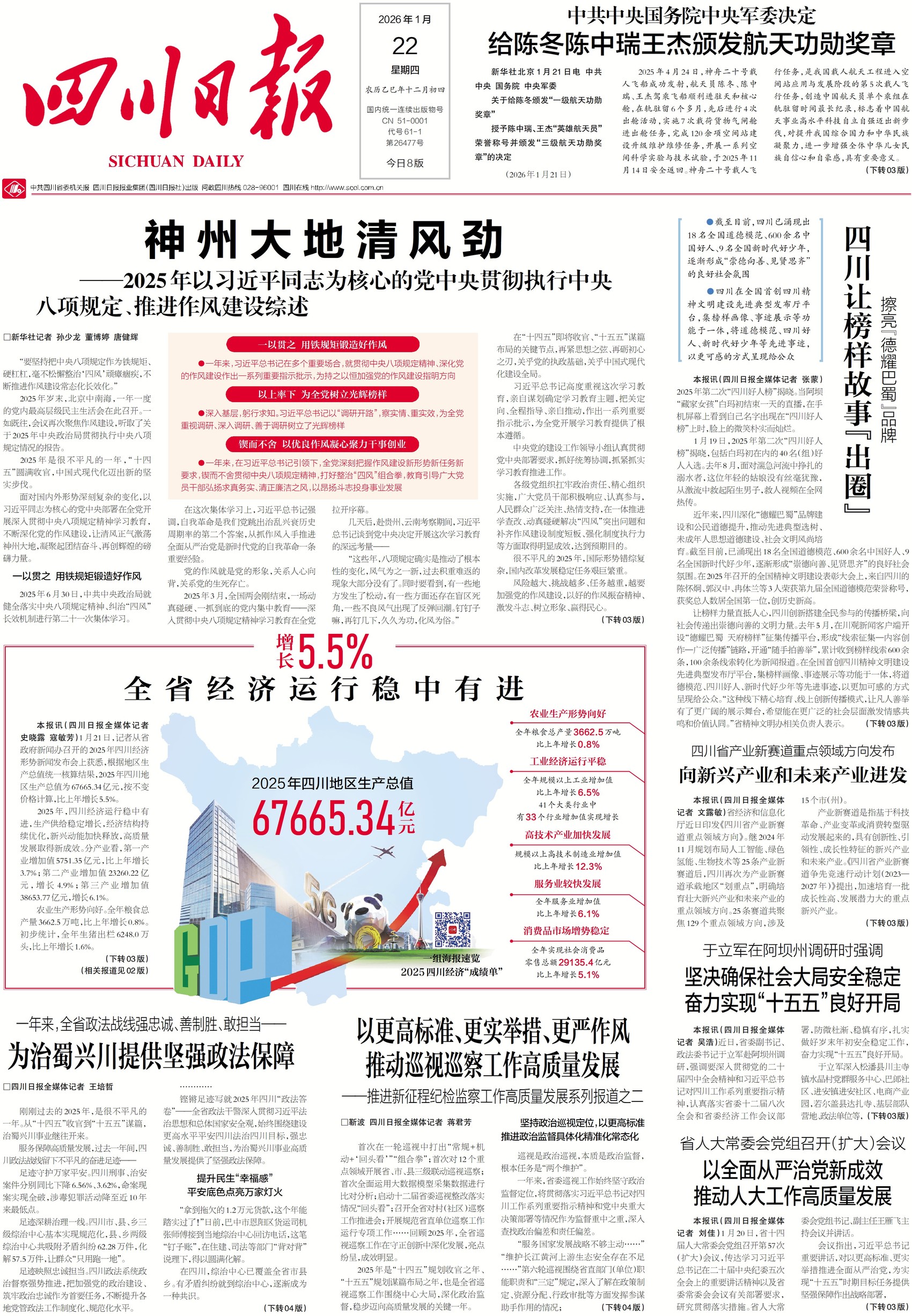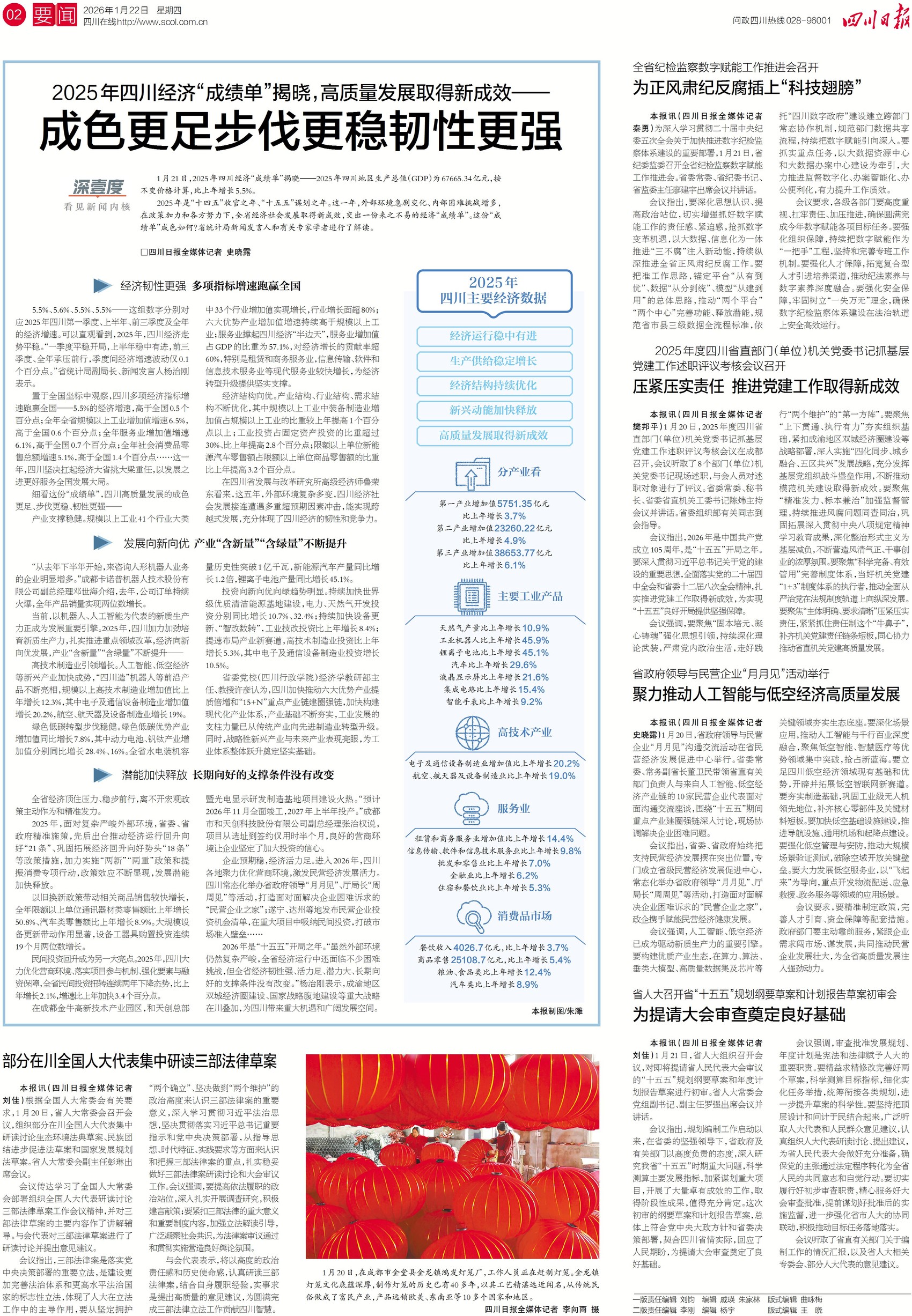 2025年四川经济“成绩单”揭晓。全省地区生产总值为67665.34亿元,比上年增长5.5%。全年全省规模以上工业增加值、服务业增加值、社会消费品零售总额等多项经济指标增速均跑赢全国。以机器人、人工智能为代表的新质生产力正成为发展重要引擎,产业“含新量”“含绿量”不断提升。今日一版、二版,看四川如何让高质量发展成色更足、步伐更稳、韧性更强。