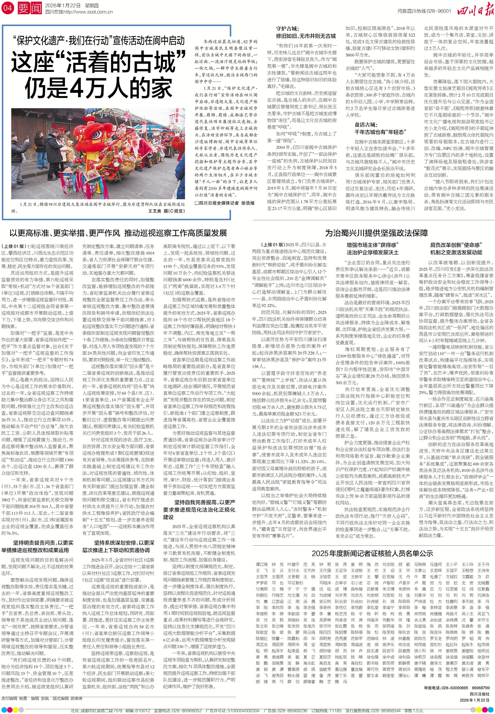 昨日, “保护文化遗产·我们在行动”宣传活动在阆中启动。非遗赶大集、文化遗产保护体验等活动在阆中古城同步开展。蜀锦、蜀绣等非遗代表性项目展演亮相,古籍修复、活字印刷等也走上街头。在不少古城古镇“千人一面”的当下,阆中古城坚持守护与盘活并举,如今仍有4万人长期居住在这里。今日四版,看阆中如何打造“活着的古城”。