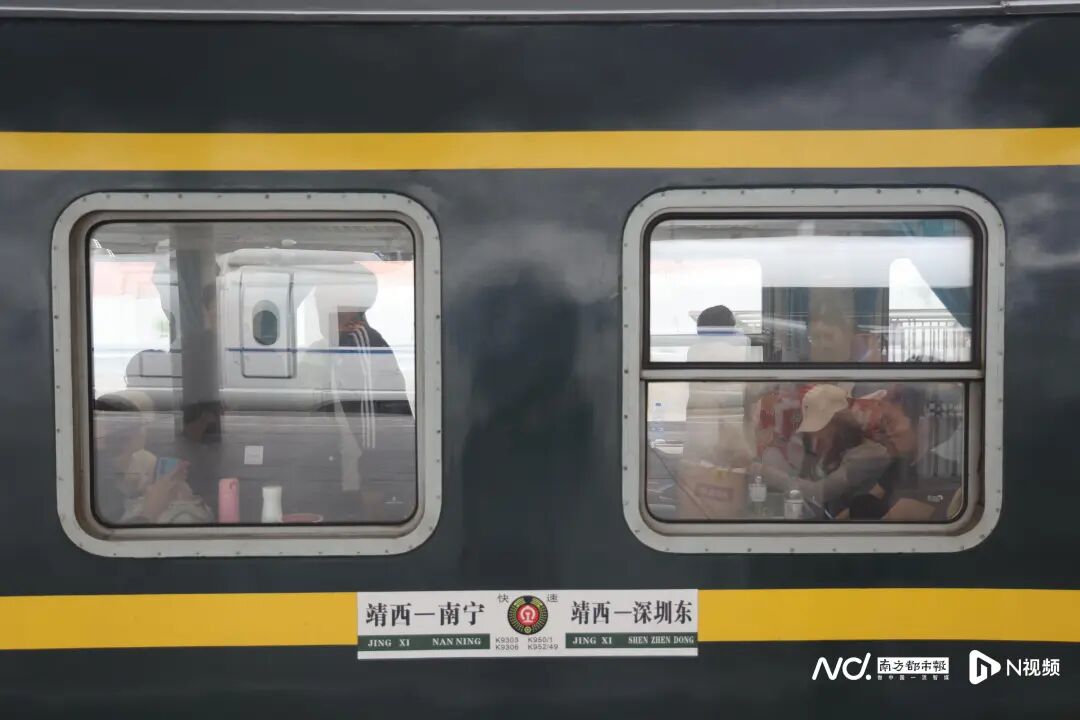15时54分,站台上,开往靖西的K952次列车车厢里,依然坐满了旅客。