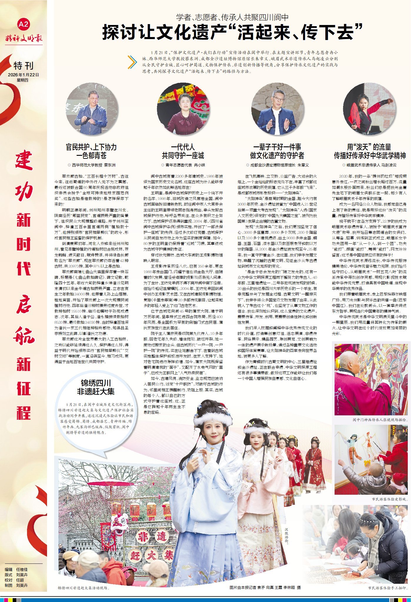 1月21日,“保护文化遗产·我们在行动”宣传活动在四川阆中举行。在主题宣讲环节,青年志愿者冉小妹讲述全民守护古城的故事,西华师范大学教授蔡东洲探讨匠心呵护蜀道的理念,成都金沙遗址博物馆原馆长朱章义分享文物保护传承的经验,峨眉武术非遗传承人马赵凌云则聚焦非遗创新传播的路径。一起来A2版看学者、志愿者与传承人齐聚一堂,共同探讨如何让文化遗产真正“活起来、传下去”。
