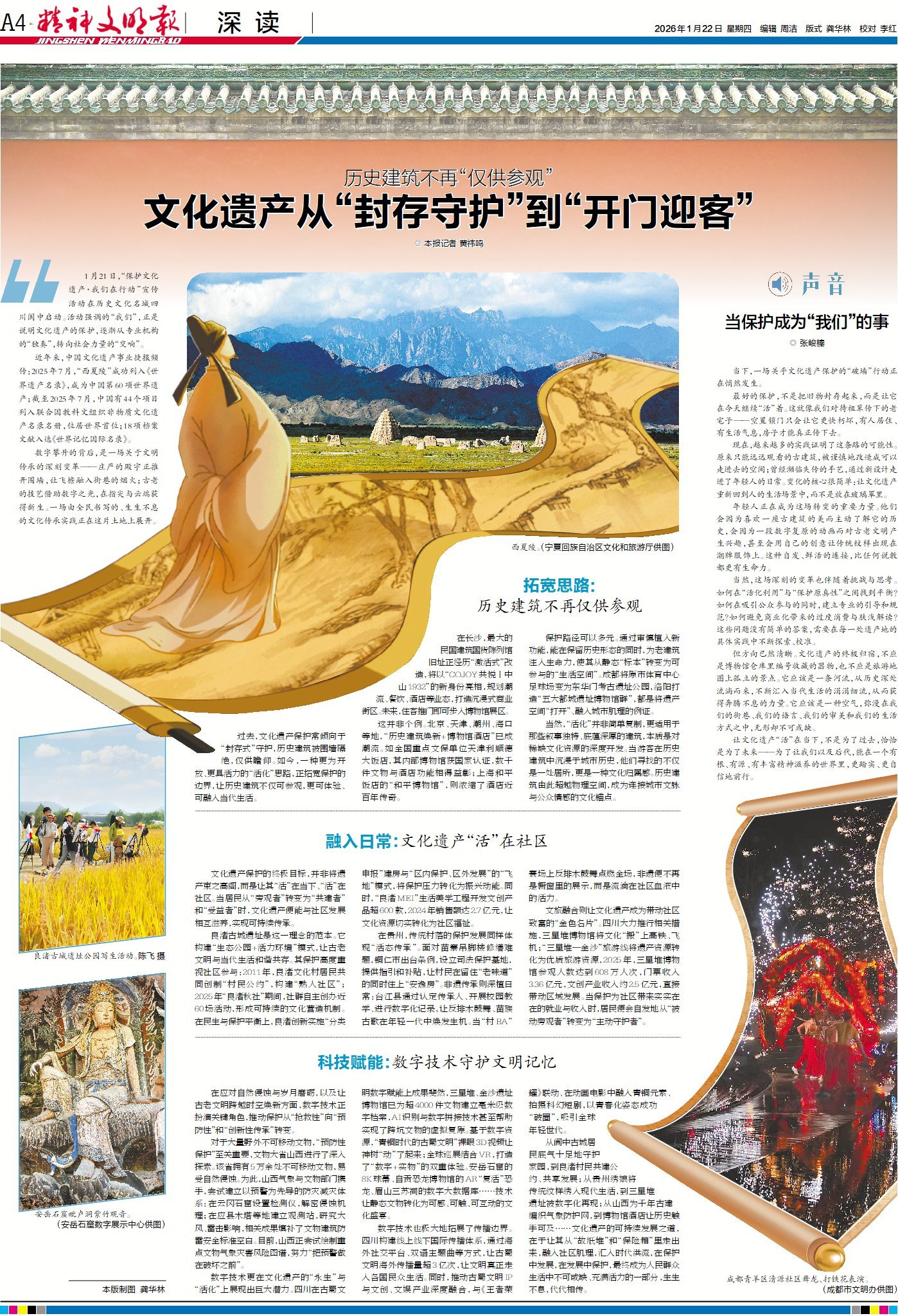 1月21日,“保护文化遗产·我们在行动”宣传活动在历史文化名城四川阆中启幕。活动强调的“我们”,正是说明文化遗产的保护,逐渐从专业机构的“独奏”,转向社会力量的“交响”,一场由全民书写的、生生不息的文化传承实践正在这片土地上展开。一起到今日A4版“深读”了解详情。