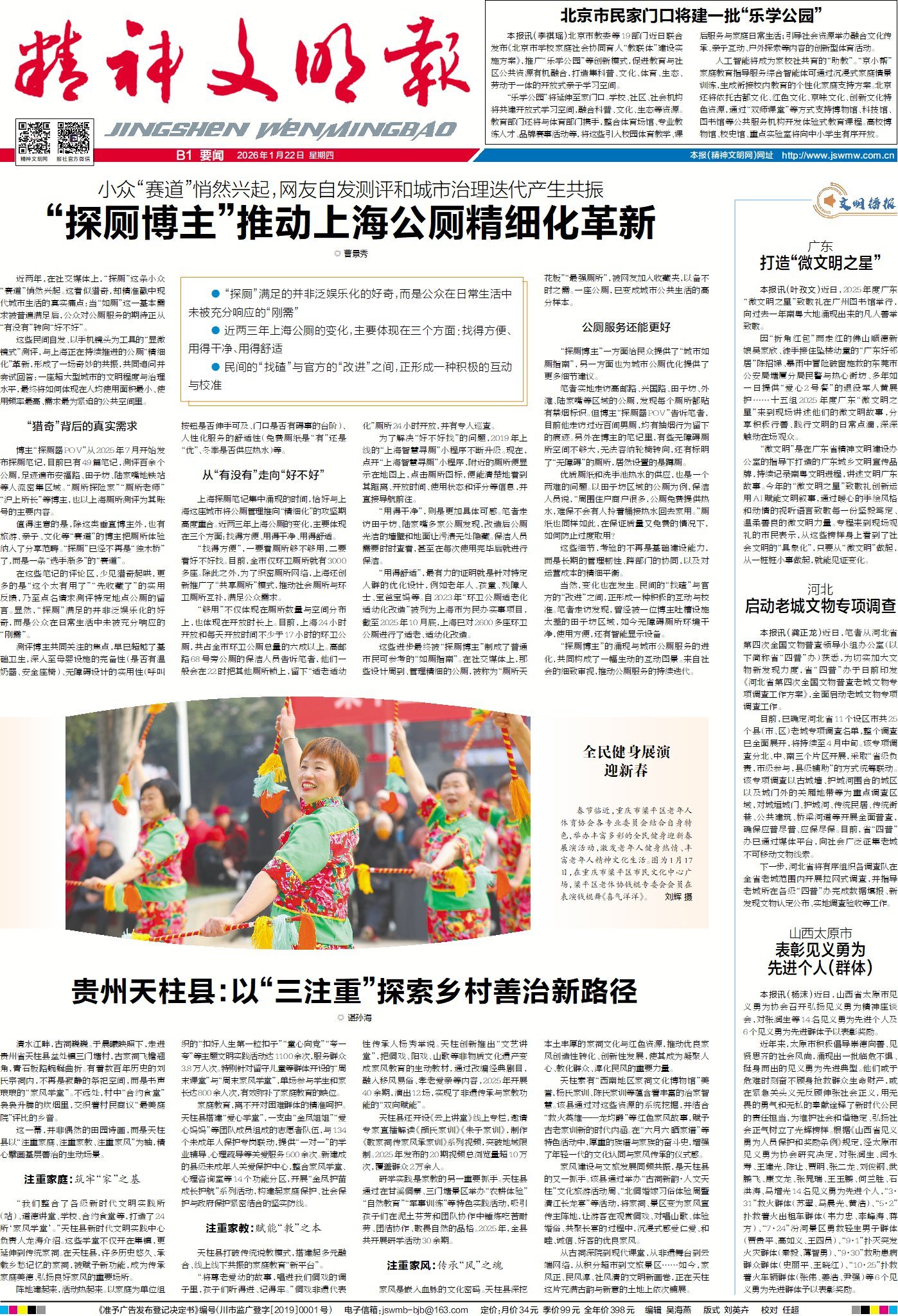 今日版面“早”知道:A1版头条报道“保护文化遗产·我们在行动”宣传活动,保护文化遗产,人人都是守护者;《城市文明我来建》栏目走进重庆市渝中区,看“文明有范儿”示范治理空间如何接地气、聚人心、可持续;《热点观察》栏目关注新品种月季取名“娇龙”,以花之名致敬好干部。A2版围绕如何让文化遗产真正“活起来、传下去”,看学者、志愿者、传承人齐聚一堂,共探传承发展的路径和方法。A4版“深读”关注文化遗产保护从专业机构“独奏”转向社会力量“交响”,开启全民参与的文化传承实践。B1版聚焦“探厕”“赛道”,看探厕博主如何推动上海公厕精细化革新。B2版“互鉴”聚焦多国探索未成年人社交管控,强化特定群体网络保护,推动构建更完善的数字环境。B3版“人物”走近四川宜宾邮政员工马永强,看他如何用28年光阴完成从普通邮递员到全国高技能人才的蜕变。B4版《文明棱镜》栏目,关注贾国龙与罗永浩的预制菜争议,针对名人如何规范自身行为、企业如何有效危机公关进行剖析。