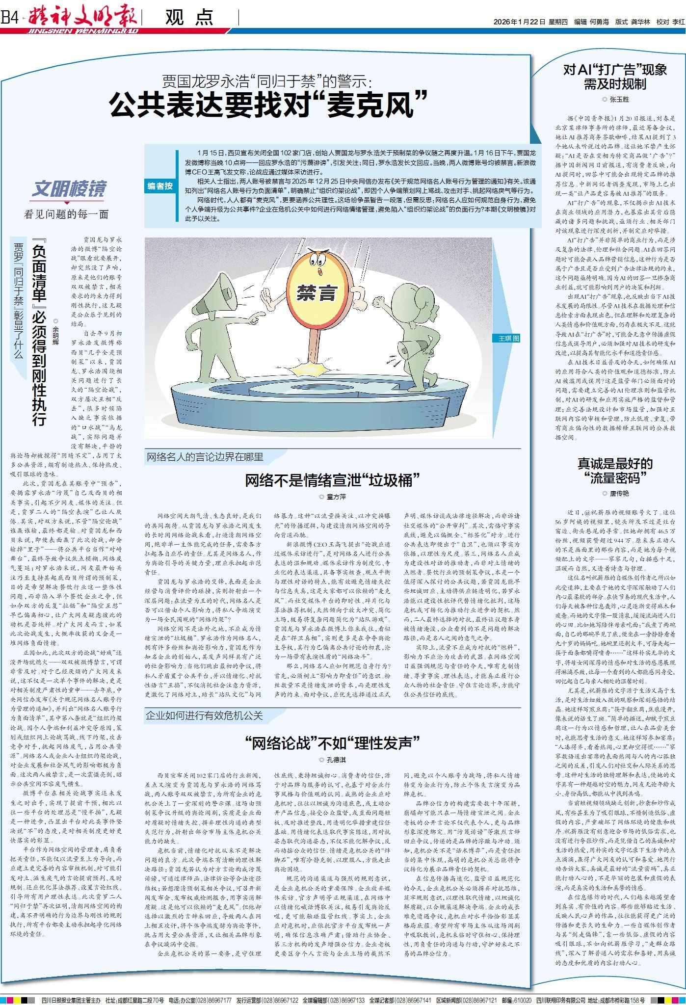 1月15日,西贝将关闭全国102家门店的消息,使创始人贾国龙与罗永浩关于预制菜的争议再度升温。1月16日下午,贾国龙发微博称当晚10点将全面回应罗永浩的“污蔑诽谤”,引发关注;同日罗永浩发长文回应。当晚两人微博账号均被禁言。这场网络纷争虽暂告一段落,但需深入反思:贾罗“同归于禁”带来什么警示?网络名人应如何规范自身行为,避免个人争端升级为公共事件?企业如何进行有效危机公关,避免陷入“组织约架论战”的负面行为?来看今日B4《文明棱镜》对这些问题的剖析。