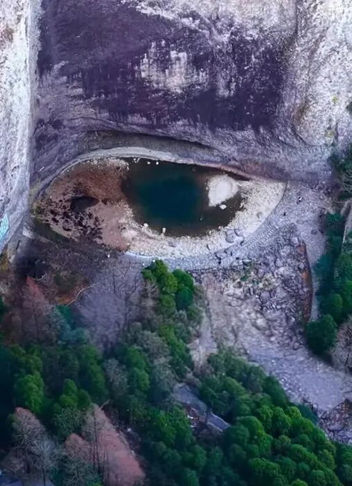 从视频画面可见,这只“龙眼”整体轮廓清晰:潭中央残留的深绿色水域宛如深邃的“瞳孔”,周围浅米色与灰褐色岩壁构成了“眼白”,上方深色岩石凹陷则形似“上眼睑”褶皱,还能看到清晰的“双眼皮”,整只“眼睛”镶嵌在灰白色崖壁底部,与下方深绿树林形成鲜明对比,更显生动立体。