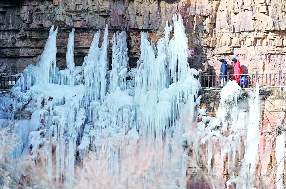 进入景区,只见沟谷蜿蜒、怪石嶙峋,岩层四周的渗水凝结成冰挂。在冻凌背景点,往日流水潺潺的山间瀑布,化作洁白无瑕的“玉带”,数十米高的冰柱高悬崖壁之上,蔚为壮观。