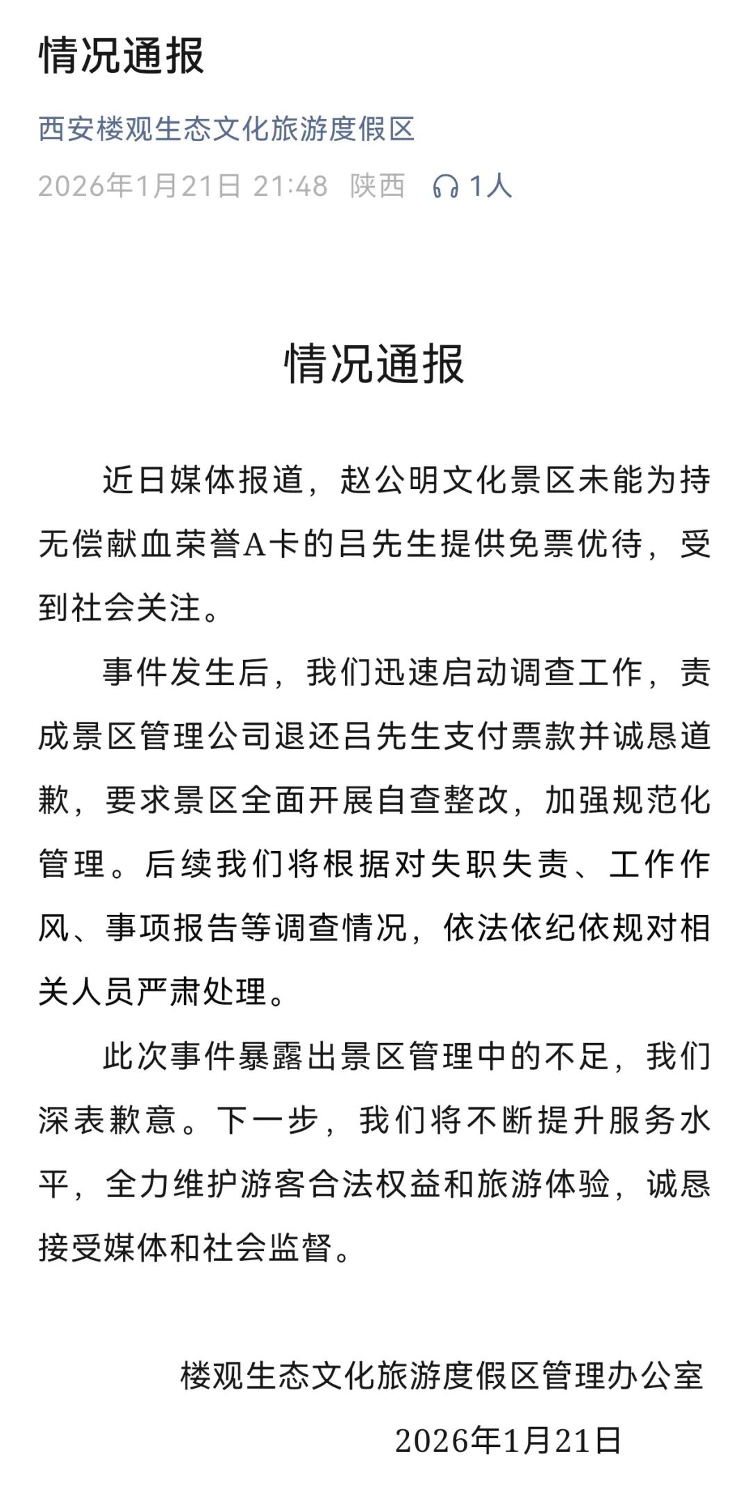 1月21日晚,陕西西安楼观生态文化旅游度假区发布情况通报: