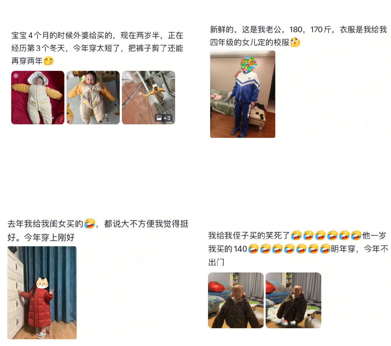 比如有人常选择远超孩子实际体型的衣物,一件衣物常常跨越多个成长阶段,4个月大婴儿的冬装囤到两岁半才合身。
