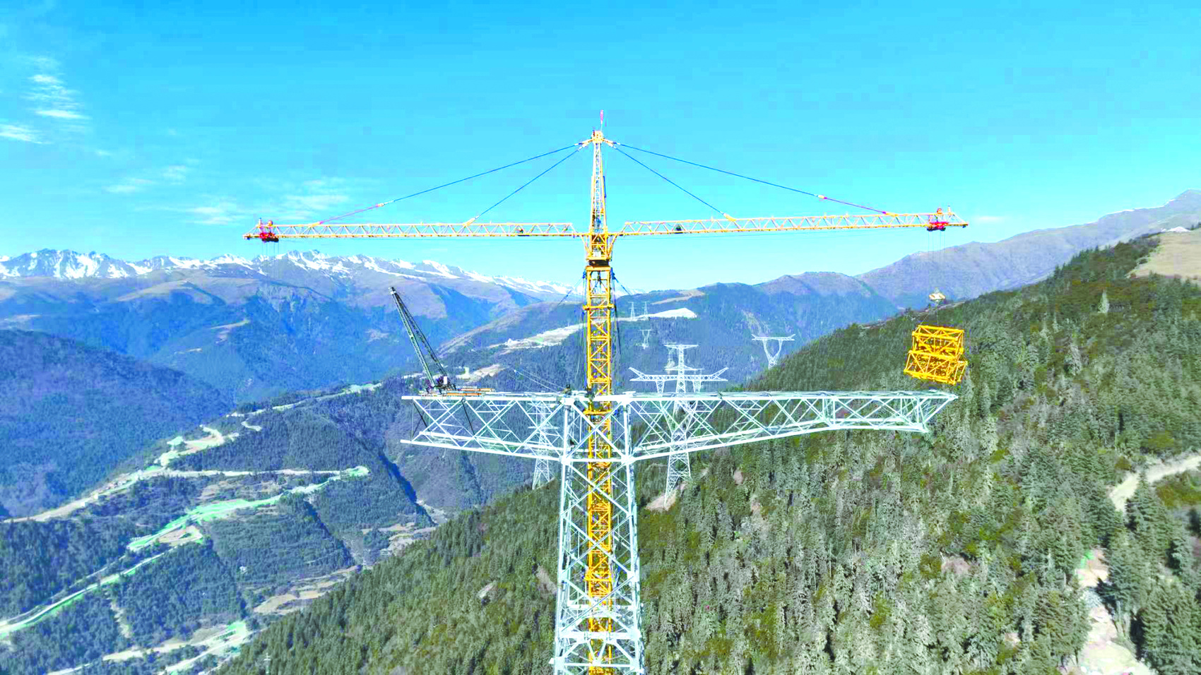 在阿坝—成都东1000千伏特高压交流输变电工程1标段现场,作业人员开展组塔作业。谢春艳 摄
