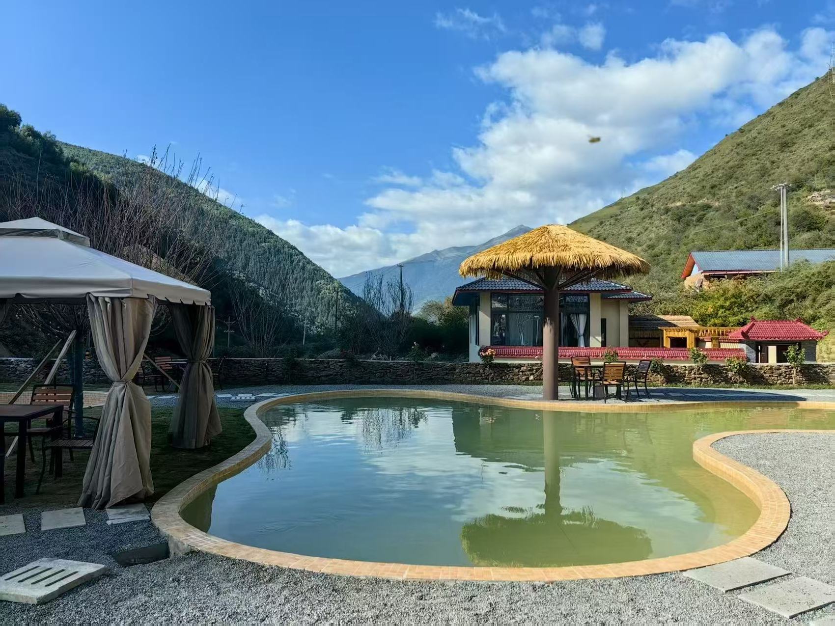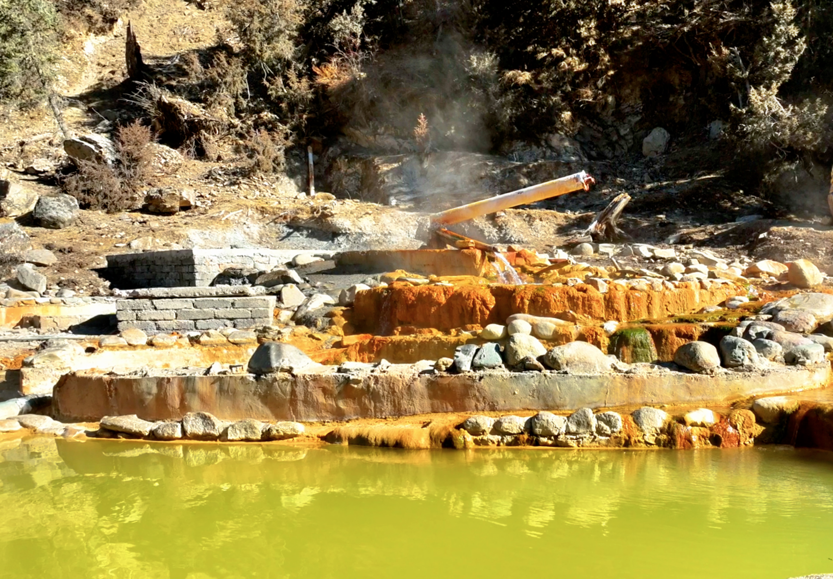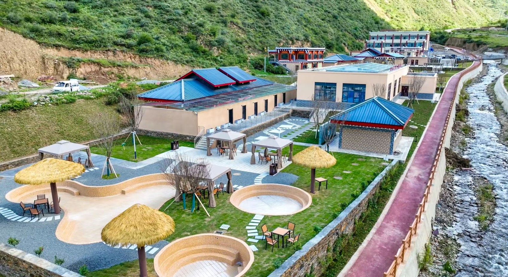 澄澈的温泉水顺着橙红色的钙华滩层层漫下,水面蒸汽与高原阳光交织成朦胧光影。原始地热泉眼翻涌着温润水花,与远处雪山、枯林构成一幅冷暖交织的冰雪两重天画卷。经过生态化打造的康养园区里,茅草伞下的汤池与藏式建筑相映成趣,游客在富含矿物质的暖汤中舒展身心,让高原的凛冽被温热泉水悄然抚平。