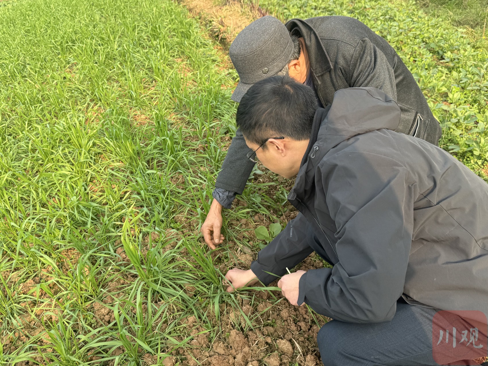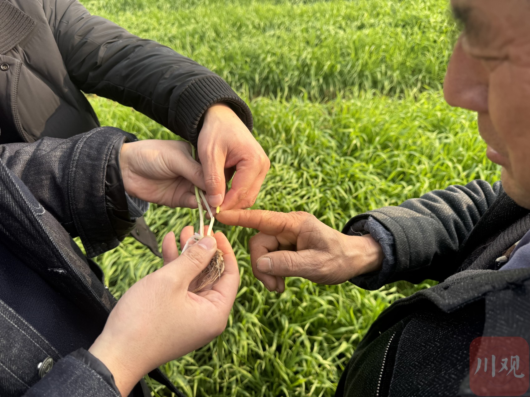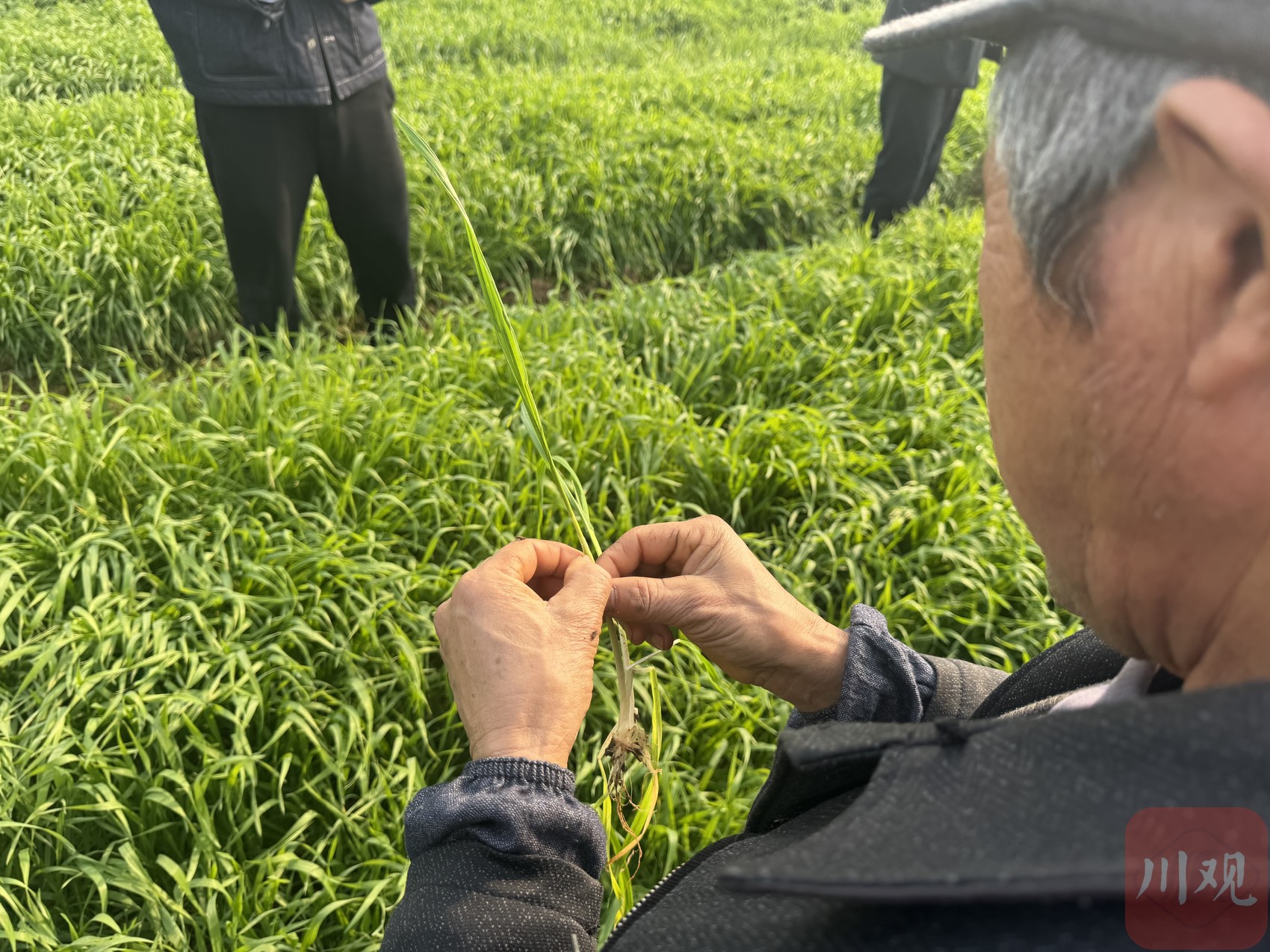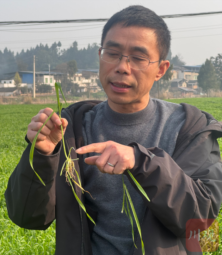 王玉是本场“考试”的监考员,也是蓬安县农业技术推广站站长。“今年冬季气温高,不少小麦提前进入拔节期,出现旺长趋势。”他向记者解释,这门考试就是要让大家通过数叶龄掌握生育进程,在茎节未超过1cm前、三叶一心到分蘖末期通过药剂化控,防止小麦生长过旺导致茎秆细长软弱,避免出现大面积倒伏。