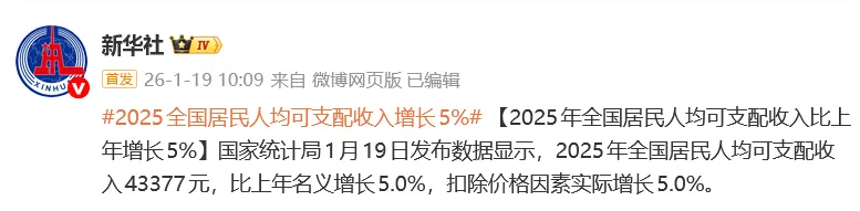 国家统计局1月19日发布数据显示,2025年全国居民人均可支配收入43377元,比上年名义增长5.0%,扣除价格因素实际增长5.0%。