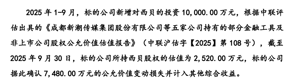 据分众传媒2025年12月底发布的《发行股份及支付现金购买资产暨关联交易报告书(草案)》(修订稿)显示,2025年1—9 月,新潮传媒新增对西贝的投资1亿元,截至2025年9月30日,新潮传媒所持西贝股权的估值为2520万元,新潮传媒据此确认7480万元的公允价值变动损失并计入其他综合收益。