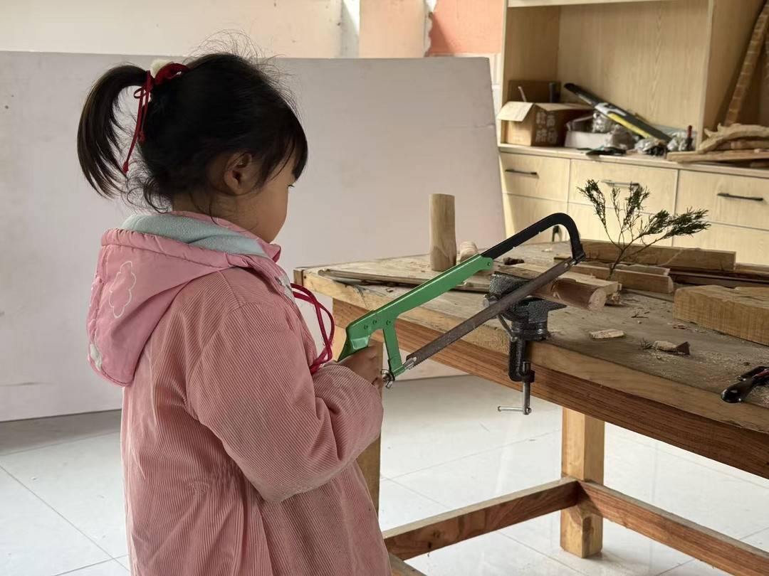 孩子在学校木工房玩耍