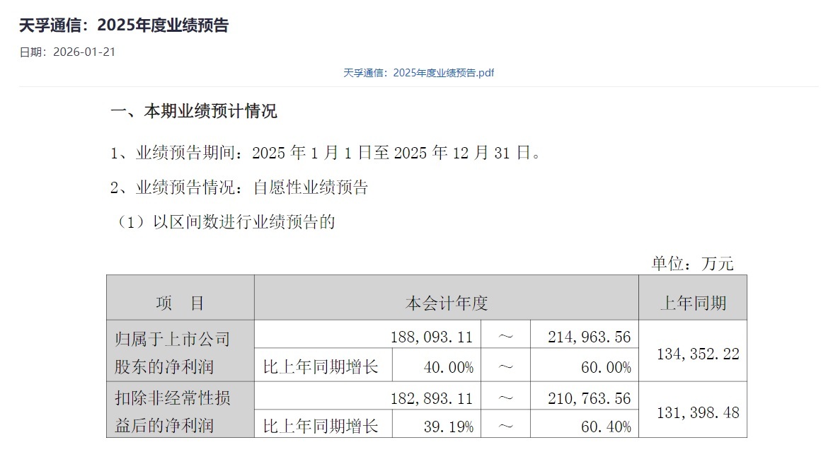 1月21日晚间,天孚通信发布2025年度业绩预告,公司预计2025年实现归属于上市公司股东的净利润约18.81亿元至21.5亿元,同比增长40 %至60%;预计2025年实现扣非净利润约18.29亿元至21.08亿元,同比增长39.19%至60.4%。