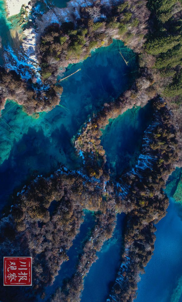 树正群海层层水面透着冬日特有的幽蓝。