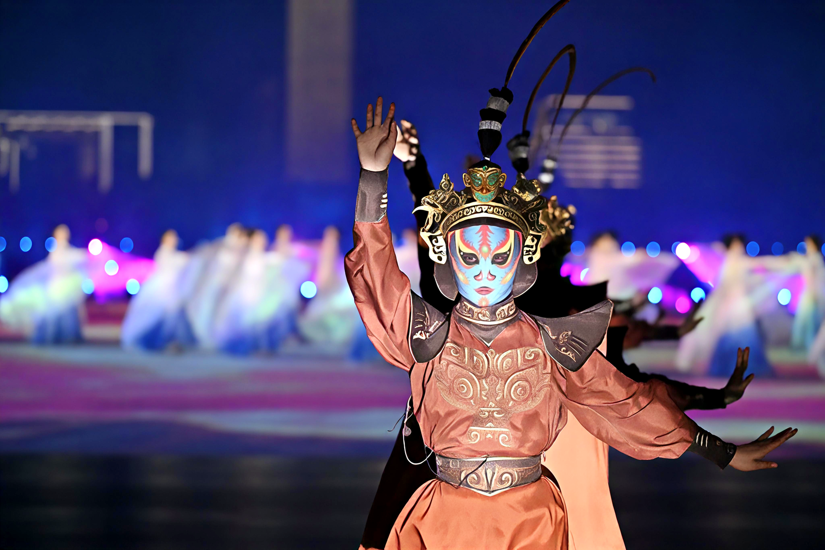 变脸,是川剧绝活的一张名片。舞台上,演员肢体的顿挫与鼓点精准咬合。整齐划一的齐舞中,演员身着青铜纹服饰在音乐中穿梭腾跃。川剧的碎步、兰花指与街舞嘻哈、爵士等舞蹈动作混搭,带来节奏感十足的现场。苍凉高亢的川剧唱腔中,演员身法变换,一张张脸谱切换呈现。更有叠罗汉等高难度动作,引发现场观众的惊呼。