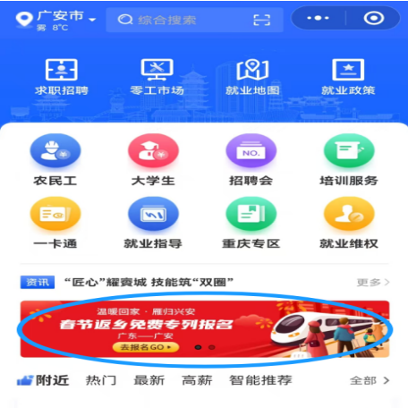 如何报名?报名时间是什么时候?有意向的广安籍乡友需通过搜索进入“广安安心就业”微信小程序,点击首页“春节返乡免费专列报名”专题,如实填写返乡信息并提交完成预约。
