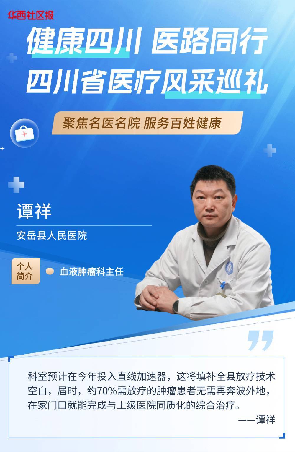 针对威胁健康的“头号杀手”肿瘤,血液肿瘤科谭祥主任团队提供了标准化的解决方案。科室不仅规范开展化疗、靶向、免疫等常规治疗,更计划于今年投入的直线加速器,将彻底结束安岳县无肿瘤放疗技术的历史,该项技术的提升将让70%需要放疗的本地患者免于异地奔波。
